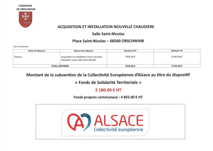 AIDE FINANCIERE DE LA COLLECTIVITE EUROPEENNE D'ALSACE POUR L'ACQUISITION ET L'INSTALLATION D'UNE NOUVELLE CHAUDIERE SALLE SAINT-NICOLAS